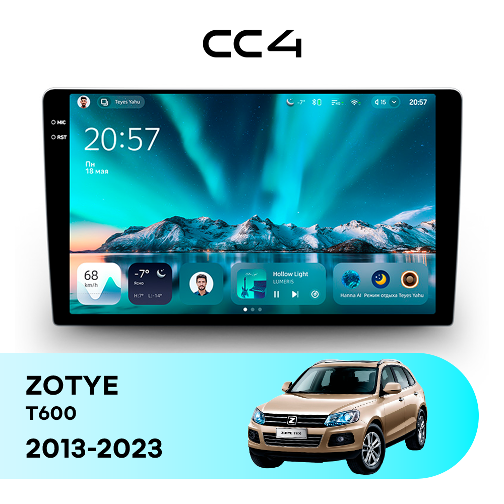 Teyes CC4 для ZOTYE T600 2013-2023 — современная штатная магнитола на базе Teyes OS Android 14, которая устанавливается вместо заводского головного устройства и значительно расширяет мультимедийные возможности автомобиля.