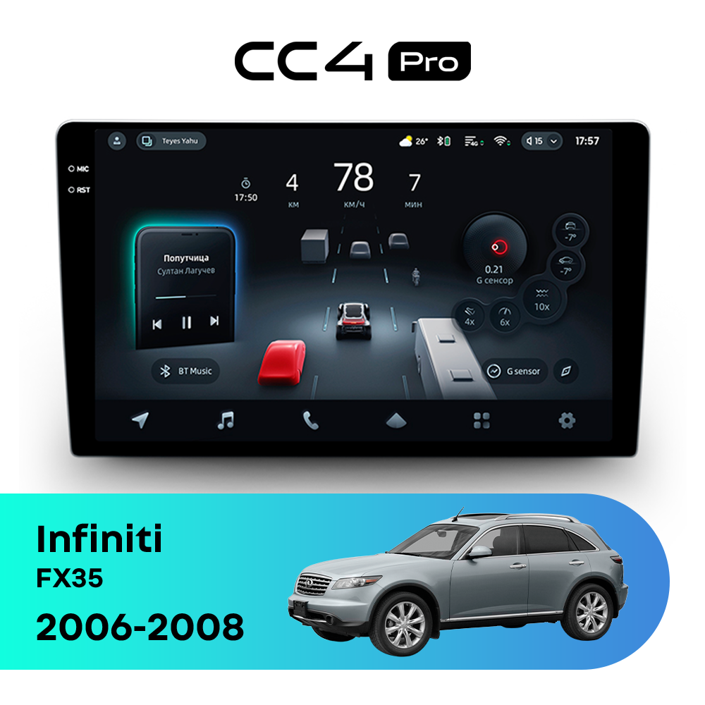 Автомагнитола Teyes CC4 Pro — это флагманская магнитола премиум-класса, созданная для владельцев Infiniti FX35 I рестайлинг (2006-2008), которые хотят получить максимум от мультимедиа в автомобиле. Магнитола Teyes CC4 Pro превращает салон Infiniti FX35 в современный цифровой центр управления с быстрым интерфейсом, топовой производительностью и премиальным изображением. Данная магнитола работает на системе Android и оснащена мощным 8-ядерным процессором Qualcomm QCM6490, что делает автомагнитолу Teyes CC4 Pro одной из самых быстрых магнитол на рынке. Конфигурация 12Gb оперативной памяти и 256Gb встроенной памяти позволяет использовать навигацию, музыку и приложения одновременно без зависаний — идеально для Infiniti FX35 (I рестайлинг (2006-2008)). Магнитола Teyes CC4 Pro оснащена премиальным In-cell QLED дисплеем диагональю 9.5" с высоким разрешением 2000×1200 пикселей, благодаря чему изображение на магнитоле остается ярким и четким при любом освещении в салоне Infiniti FX35. Автомагнитола поддерживает Яндекс Навигатор, Google Maps, YouTube, голосовое управление Teyes, камеры заднего вида и 360°, а также штатные кнопки на руле — всё для максимального комфорта в Infiniti FX35 I рестайлинг (2006-2008). Магнитола Teyes CC4 Pro — это идеальный выбор для премиальных автомобилей и требовательных водителей, особенно если вы цените комфорт в Infiniti FX35. Если вы ищете лучшую магнитолу Android без компромиссов для Infiniti FX35 — автомагнитола Teyes CC4 Pro станет оптимальным решением.