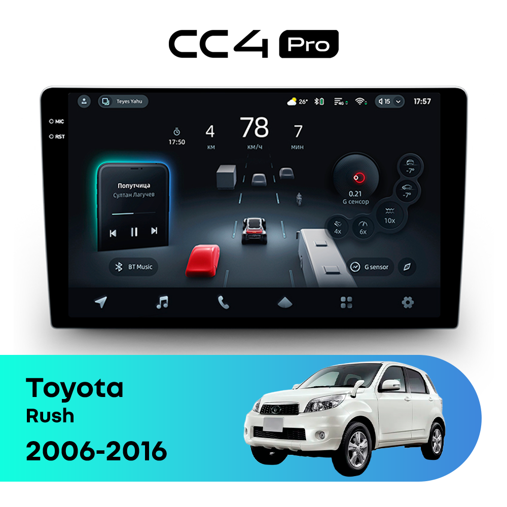 Автомагнитола Teyes CC4 Pro — это флагманская магнитола премиум-класса, созданная для владельцев Toyota Rush I (2006-2016), которые хотят получить максимум от мультимедиа в автомобиле. Магнитола Teyes CC4 Pro превращает салон Toyota Rush в современный цифровой центр управления с быстрым интерфейсом, топовой производительностью и премиальным изображением. Данная магнитола работает на системе Android и оснащена мощным 8-ядерным процессором Qualcomm QCM6490, что делает автомагнитолу Teyes CC4 Pro одной из самых быстрых магнитол на рынке. Конфигурация 12Gb оперативной памяти и 256Gb встроенной памяти позволяет использовать навигацию, музыку и приложения одновременно без зависаний — идеально для Toyota Rush (I (2006-2016)). Магнитола Teyes CC4 Pro оснащена премиальным In-cell QLED дисплеем диагональю 9.5" с высоким разрешением 2000×1200 пикселей, благодаря чему изображение на магнитоле остается ярким и четким при любом освещении в салоне Toyota Rush. Автомагнитола поддерживает Яндекс Навигатор, Google Maps, YouTube, голосовое управление Teyes, камеры заднего вида и 360°, а также штатные кнопки на руле — всё для максимального комфорта в Toyota Rush I (2006-2016). Магнитола Teyes CC4 Pro — это идеальный выбор для премиальных автомобилей и требовательных водителей, особенно если вы цените комфорт в Toyota Rush. Если вы ищете лучшую магнитолу Android без компромиссов для Toyota Rush — автомагнитола Teyes CC4 Pro станет оптимальным решением.