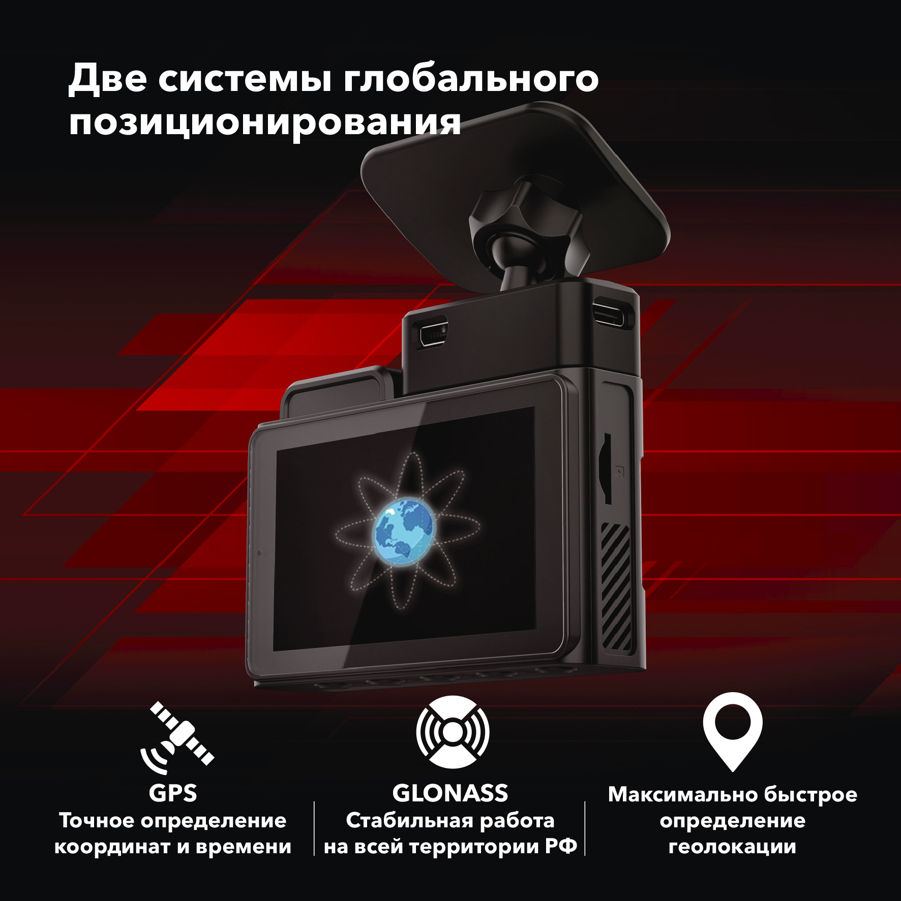 - Встроенный GPS для фиксации координат, скорости, даты и времени